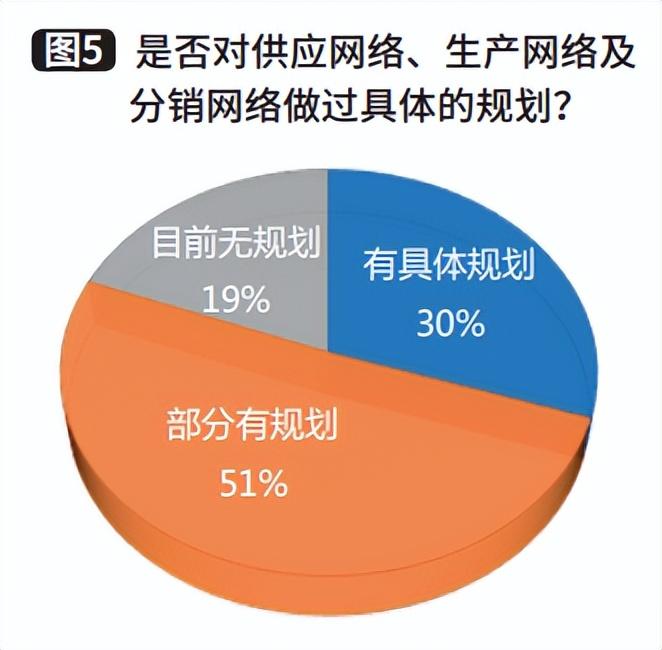 30%的企业有了具体的供应链网络规划,51%的企业部分有规划,仅有19%的企业尚未实施网络规划(见图5),这与企业的类型和发展规模也直接相关。