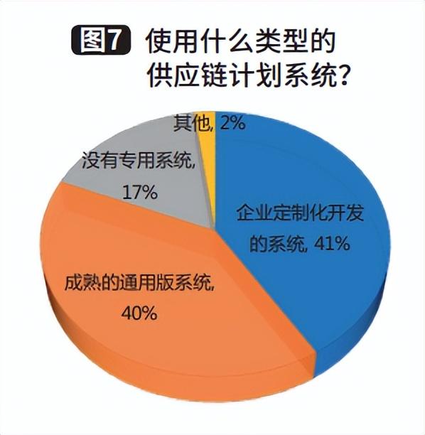 41%的企业使用定制化开发的系统,40%的企业使用成熟的通用版系统,仅有17%的企业未曾重视(见图7)。供应链计划系统作为衔接上下游合作伙伴、进行计划协同的关键系统,在供应链计划管理中,重要的是寻找更优,而不是最优的解决方案。很多企业的计划系统沦为“摆设”,一方面,是因为没有进行合理有效的业务规划和梳理;另一方面,信息系统功能超前,超越了组织的现有能力,无法发挥作用。