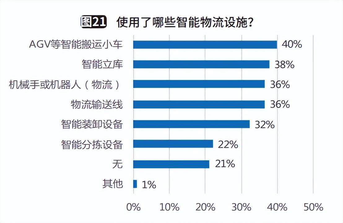 超过1/3企业开始投入使用各类智能物流设备,智能物流设施的应用成为新趋势。智能搬运设备、智能立库、输送线应用较多。22%的企业尚未引入任何智能物流设施(2020年这一数据为49%)(见图21)。