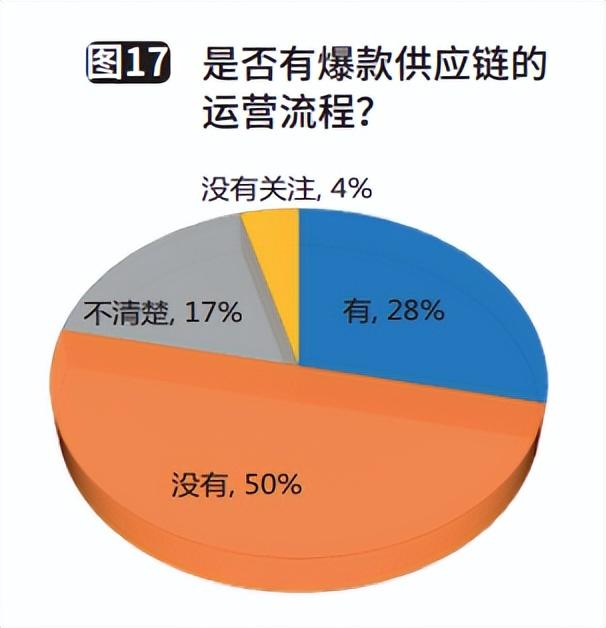 目前仅有28%的企业有和爆款相关的运营流程,50%明确没有爆款供应链,17%不清楚,4%没有关注过爆款供应链(见图17)。