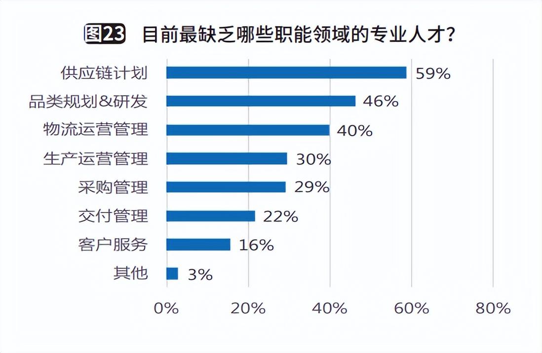 近60%的受访企业缺乏专业的供应链计划人才,供应链计划作为各个环节协同的龙头职能,存在很大的市场缺口。46%的企业缺乏品类规划&研发人才。在物流管理、生产运营管理、采购管理这三大传统供应链领域里,专业人才的缺乏也占受访企业的30%以上(见图23)。