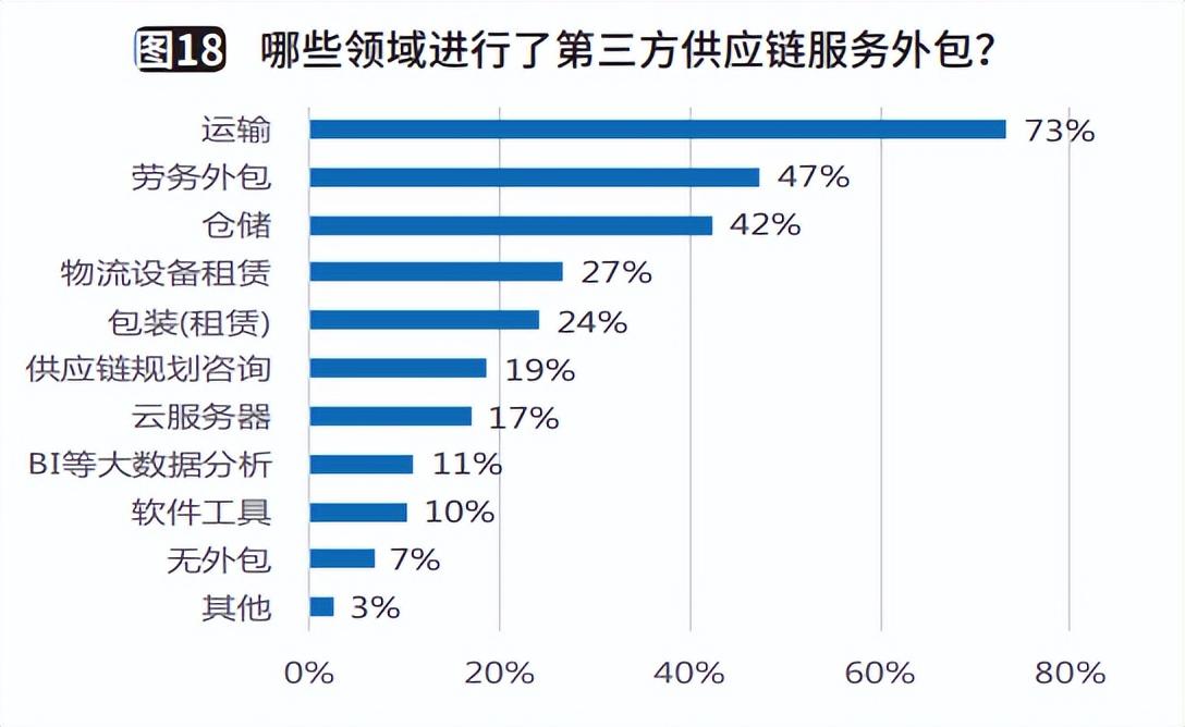 运输、仓储、劳务外包仍是供应链服务外包的主流项目,73%的企业使用运输外包,接近50%的企业使用仓储和劳务外包,与2020年的数据基本持平。设备、包装租赁服务不到30%,咨询、云服务、软件平台等高阶服务不到20%(见图18)。