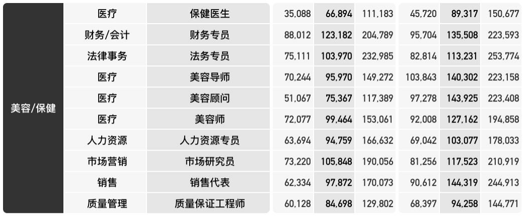 地域不同,不同行业的医药代表薪资水平也有所差异。报告公布了健康管理、美容/保健、医疗连锁、医疗器械行业、医疗服务机构的热门职位薪酬数据。