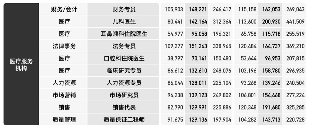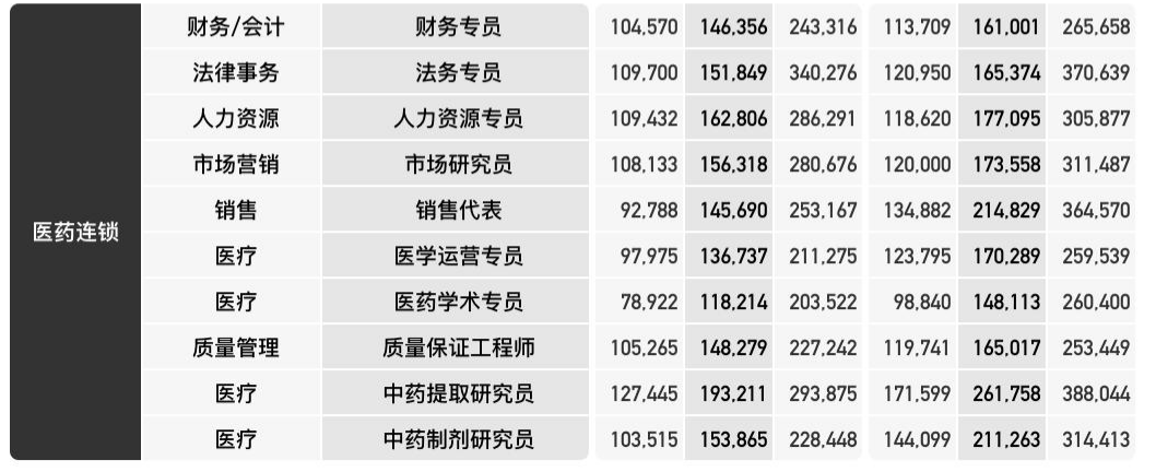 从二线城市看,医疗连锁行业薪资最高,医药销售代表10分位达到68977元,50分位为108303元,90分位为188199元。年总现金收入中,10分位达到100268元,50分位达到159699元,90分位达到271014元。