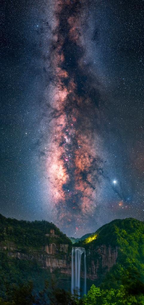 ↑星联CSVA摄影师瞿晓峰2019年7月27日在重庆江津四面山望乡台瀑布拍摄到的“直立银河”。(星联CSVA供图)