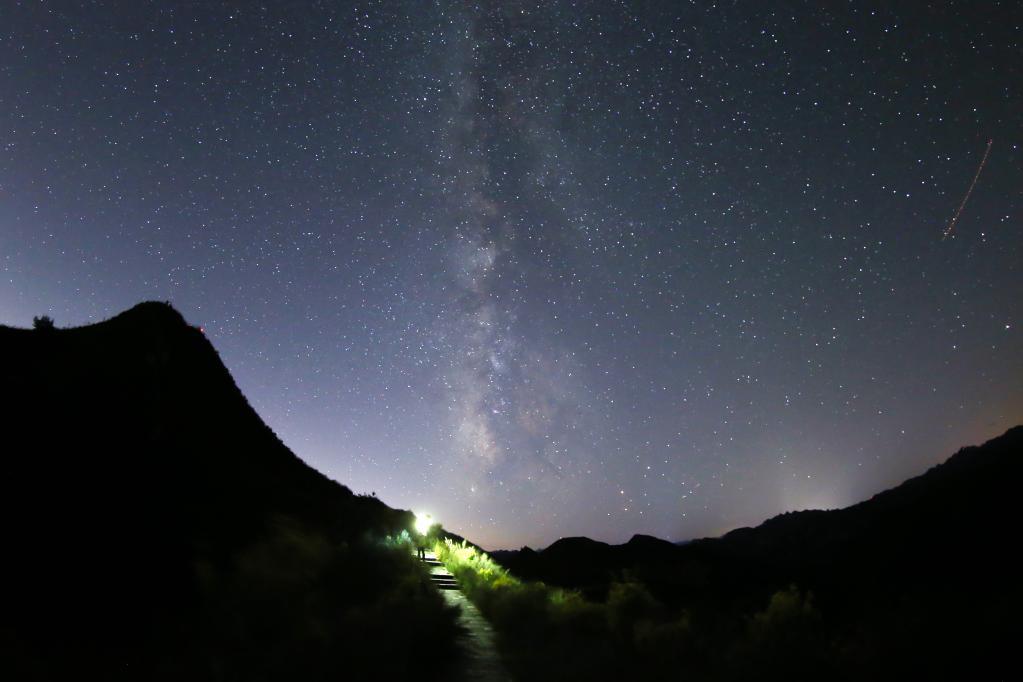↑北京市天文爱好者王俊峰2016年8月27日在北京房山拍摄到的“直立银河”。(本人供图)