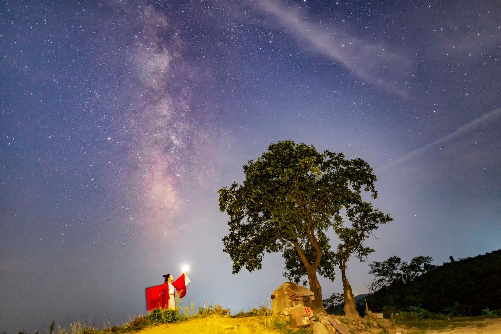 ↑河南省天文爱好者何五昌2019年8月25日在河南宝丰县观音堂林站拍摄到的一位身着汉服的市民与“直立银河”合影。(本人供图)