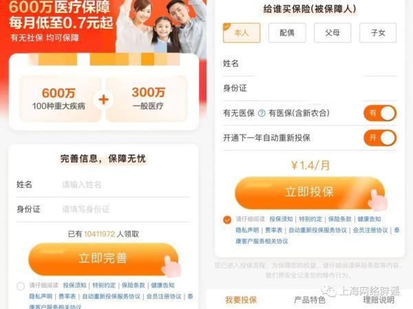 在网络安全专家指导下,记者点击该短信内附带的链接,发现跳转到一个“600万医疗保障每月低至0.7元起,有无社保均可保障”的界面,出售重大疾病保险产品。该界面还要求点击者填写手机号验证,并进一步要求点击者填写姓名、身份证等个人信息。