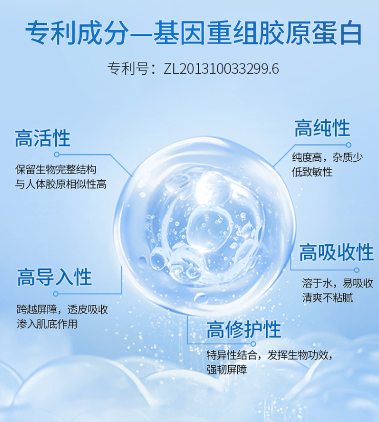 不仅保留了胶原蛋白的原始功效,更因其与人体高度同源,具有“高活性”、“高水溶”、“高亲肤”,“无病毒隐患”、“无排异反应”、“无杂质蛋白”、“无内毒素隐患”等优点。