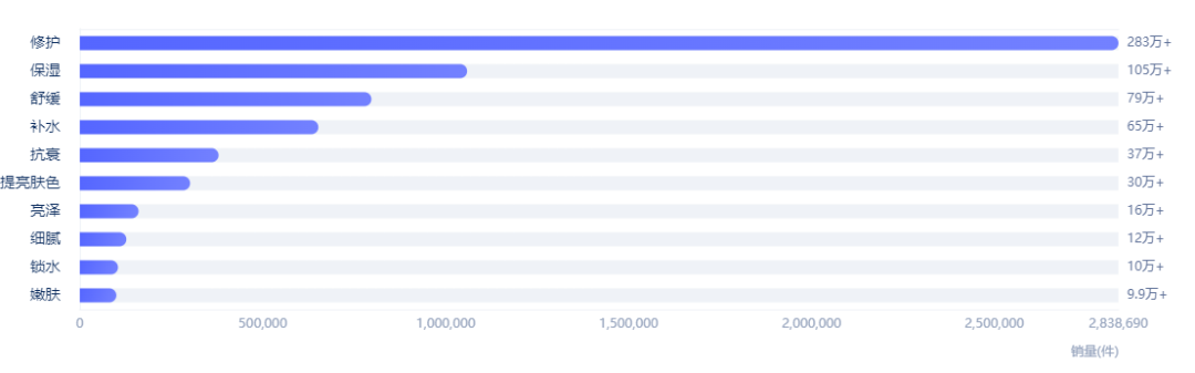 热门功效榜单前20名里,除了“去痘”出现下跌趋势,其他功效均量额齐升,由此可见,