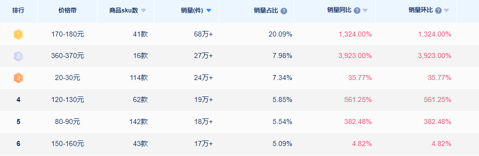 消费者对于“重组胶原蛋白”的价位接受度较高,各价格段位的销量及销售额均呈现增长趋势,价格数据榜单一片红海