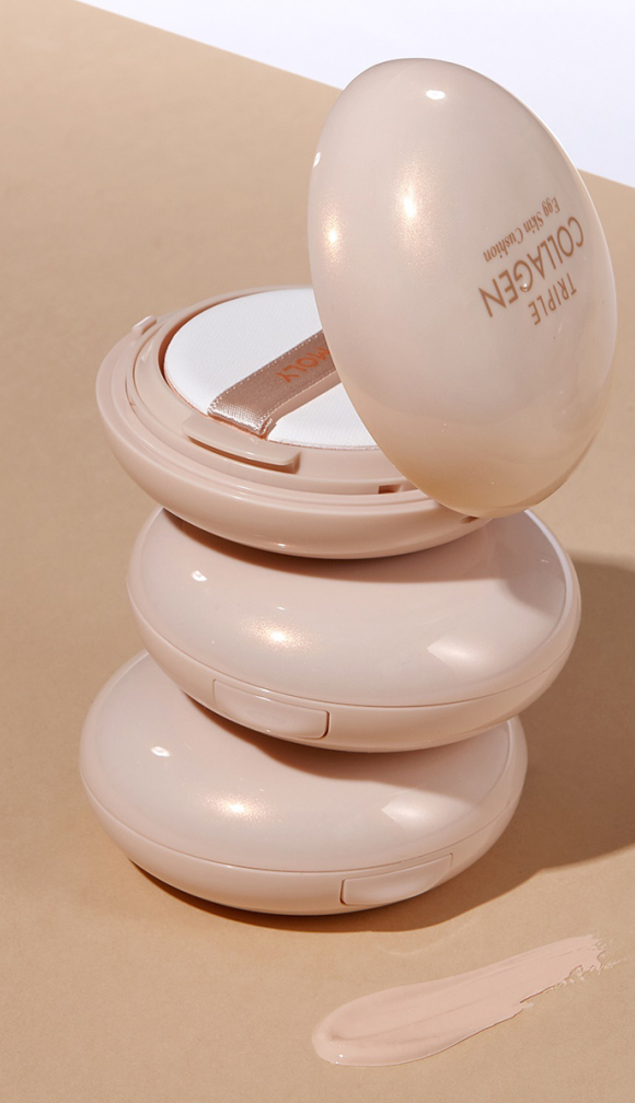 韩国品牌TONYMOLY 推出气垫,特别添加40%三重胶原蛋白复合物,复配维C、透明质酸、谷胱甘肽,上妆的同时帮助补水美白,打造光滑妆效。