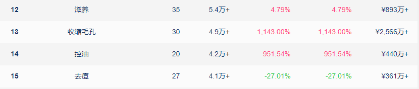 “收缩毛孔”的功效以销量同比上涨1,143.00% ,销售额同比上涨1,904.00%的超高优势占据热门功效榜单第13位;“控油”功效以销量同比上涨951.54%,销售额同比上涨1,118.00%的优势占据功效榜单第14位。