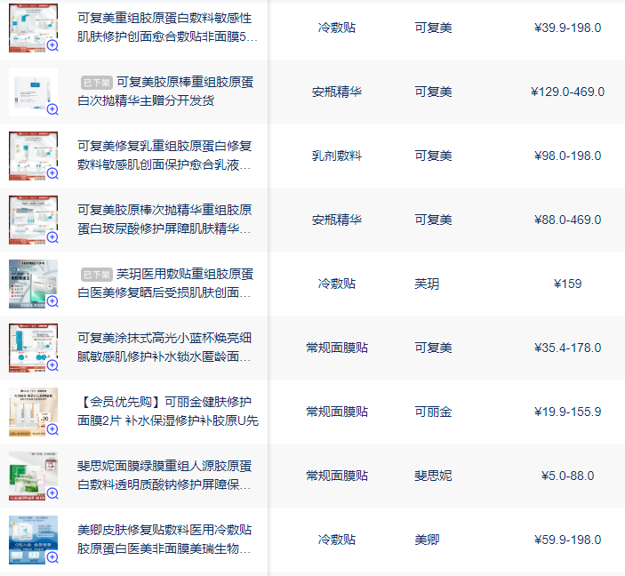 重组胶原蛋白处在一个风口与销量主导的节点上,目前仍在滚雪球式发酵,美业颜究院大数据系统抓取到,其面部护肤品类与医疗器械类各分江山,