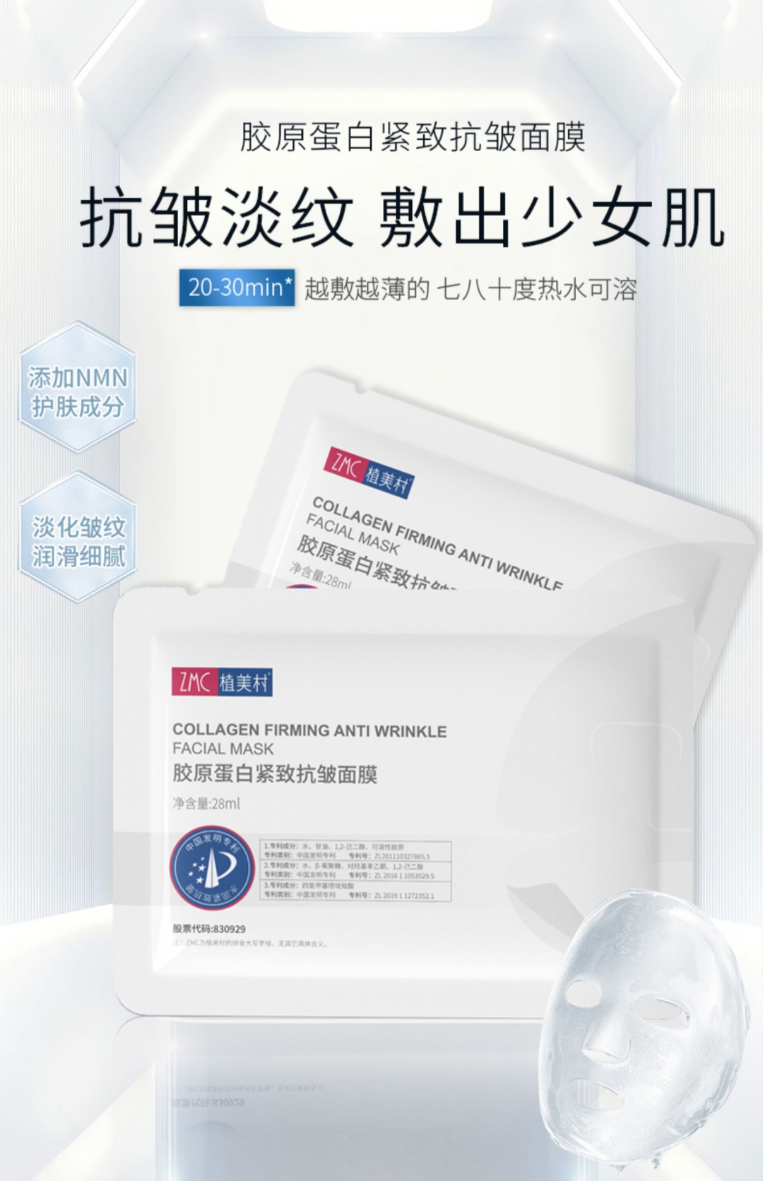 植美村推出「胶原蛋白」紧致抗皱面膜,宣称采用水晶膜布,越敷越薄,使用后面膜会变成液体,作为精华液继续使用。