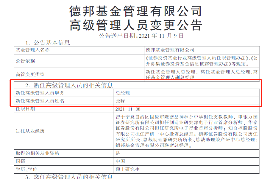 11月9日,德邦基金公告称,原联席总经理张騄正式出任公司总经理。