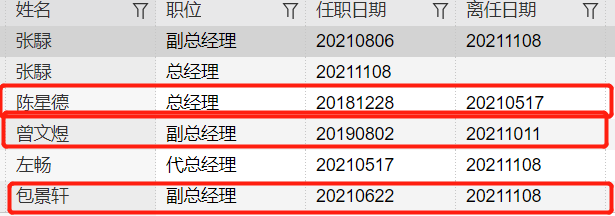 其中,曾文煜于今年10月离任,而今年6月份刚刚升任副总经理的包景轩,也在张騄接任总经理的几乎同时,离职。(见下图)