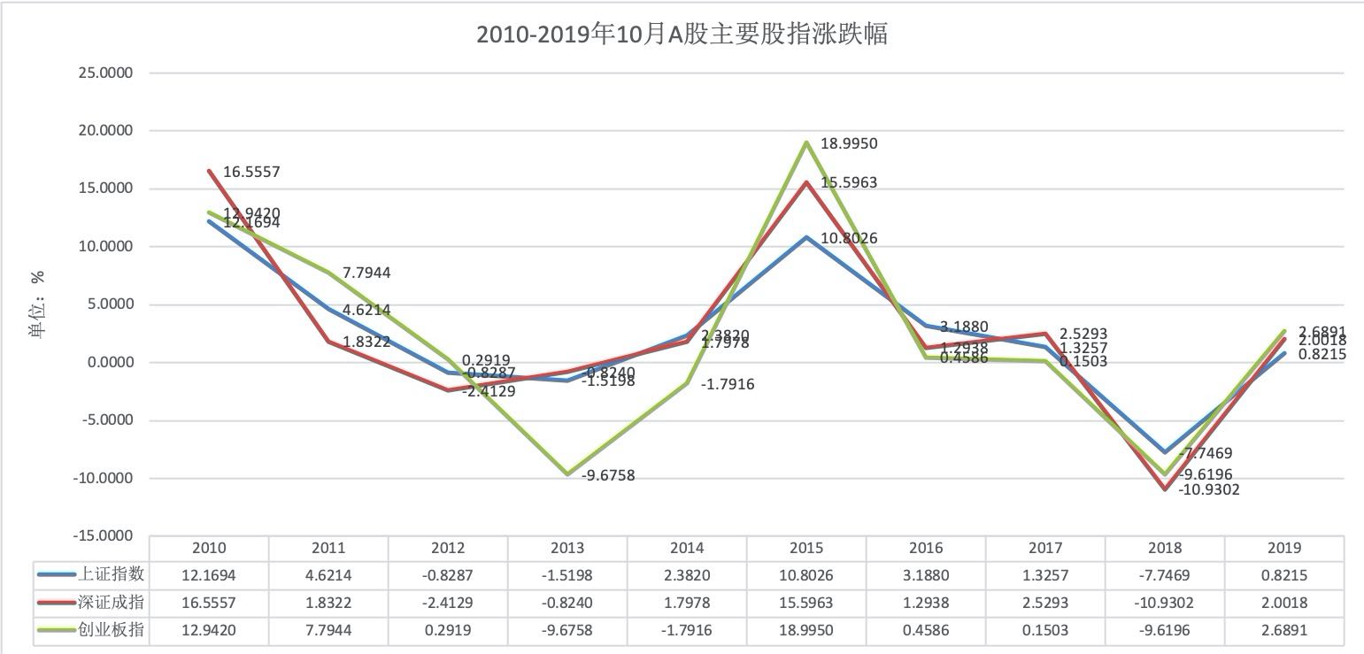 而将时间轴拉长至10月整月,2010-2019年10月A股三大股指均出现7次上涨、3次下跌。其中,2018年为三大指数跌幅最明显的一年,2010、2015年涨幅最为突出。