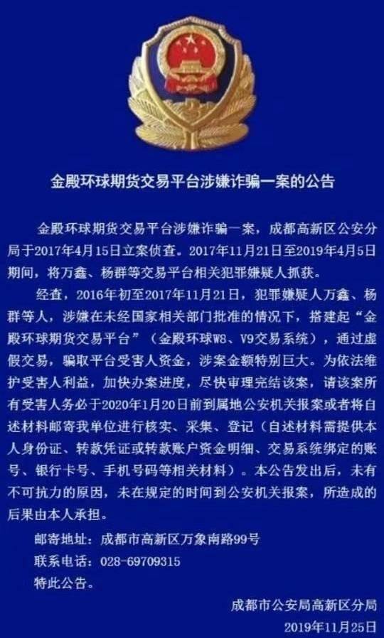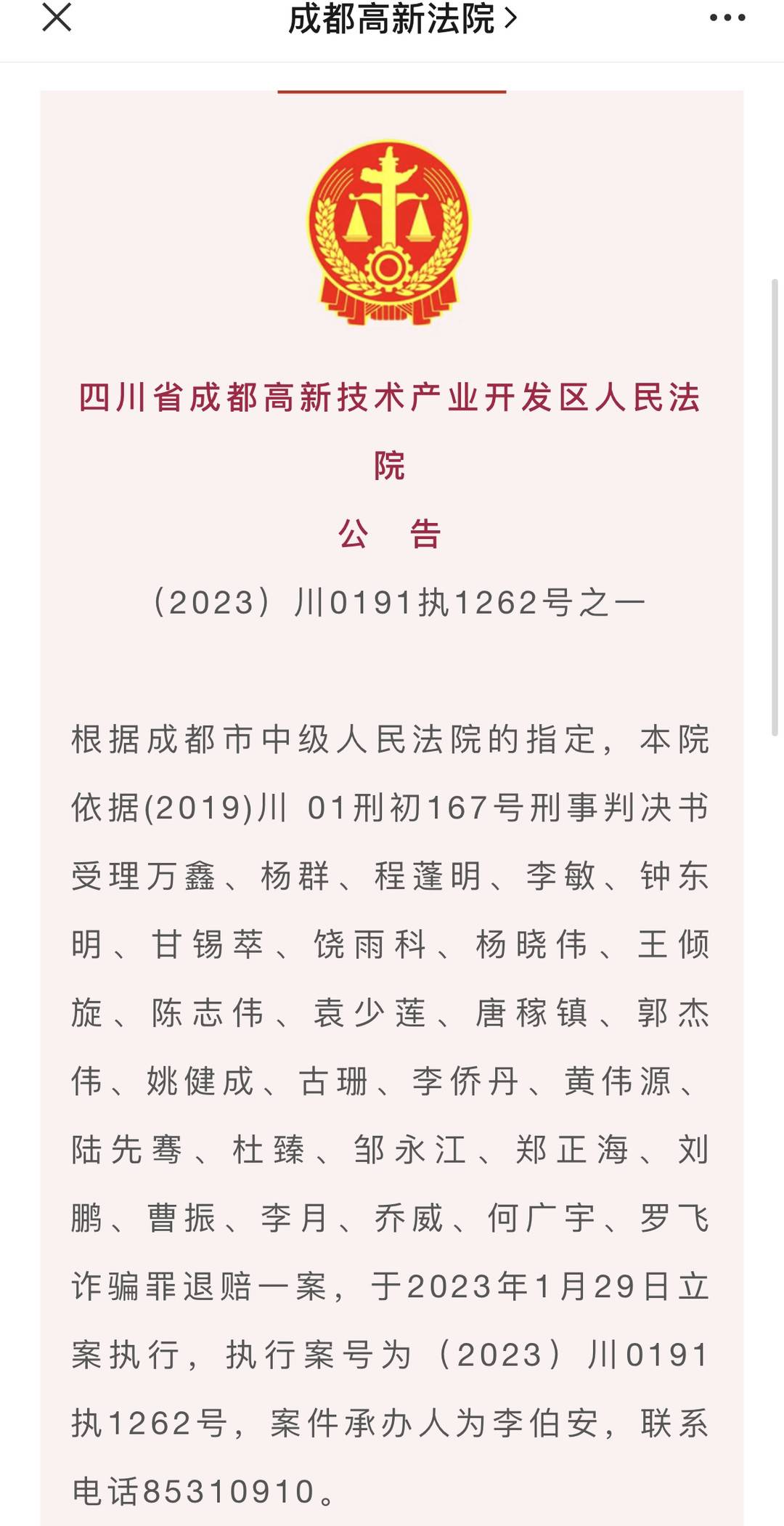 2月17日,成都高新法院发布金殿环球案的一则公告:根据成都市中级人民法院的指定,法院依据(2019)川 01刑初167号刑事判决书受理万鑫、杨群、程蓬明等人诈骗罪退赔一案,于2023年1月29日立案执行,执行案号为(2023)川0191执1262号。
