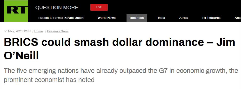 在奥尼尔看来,尽管“去美元化”还未真正发生,但由新兴国家组成的金砖国家可以向美元的霸权地位提起挑战。“我确实认为,作为两个最大的新兴世界国家,如果中国和印度能够在各种事务上达成强烈的一致......那么这可能会加速美元统治地位的结束。”