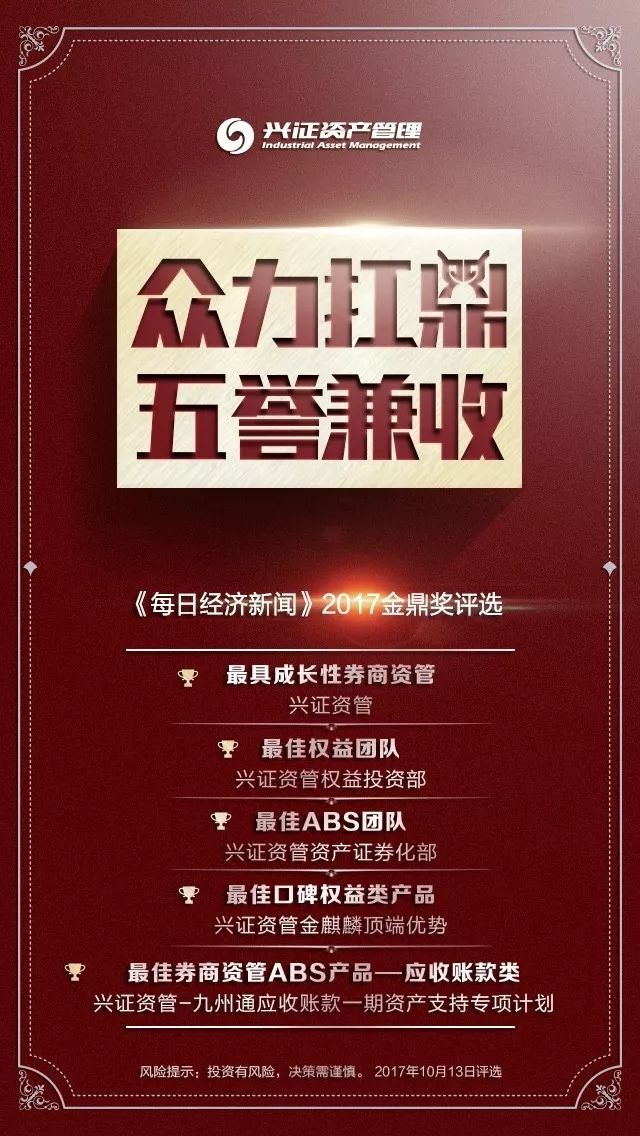 10月13日,在由《每日经济新闻》主办的“2017中国资管行业”论坛暨大资管行业金鼎奖评选中,兴业证券资管子公司——兴证证券资产管理有限公司(兴证资管)荣获五个奖项,为本次获奖数量最多的券商资管机构之一,奖项涵盖公司、团队、产品三个方面。