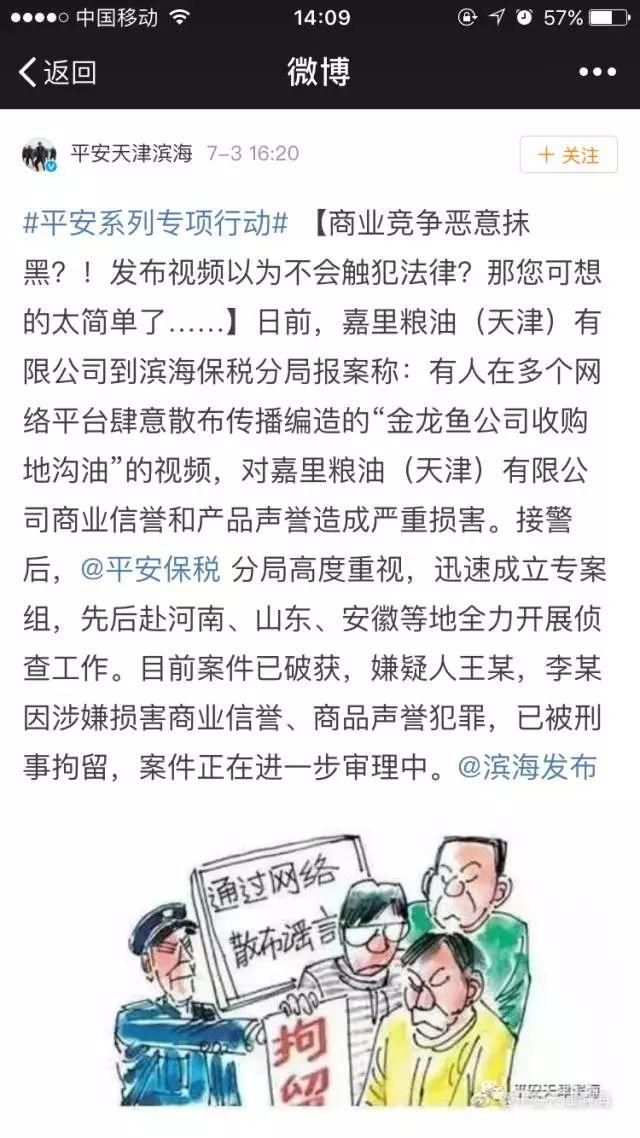7月3日16点,天津市滨海新区公安局官方微博宣称:关于造谣传谣“地沟油被金龙鱼回收”案件已破获,嫌疑人王某、李某因涉嫌损害商业信誉、商品声誉犯罪,已被刑事拘留,案件正在进一步审理中。