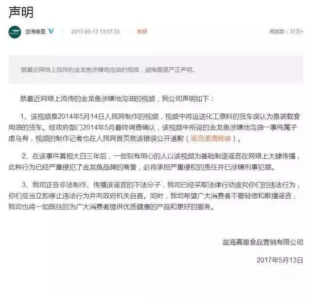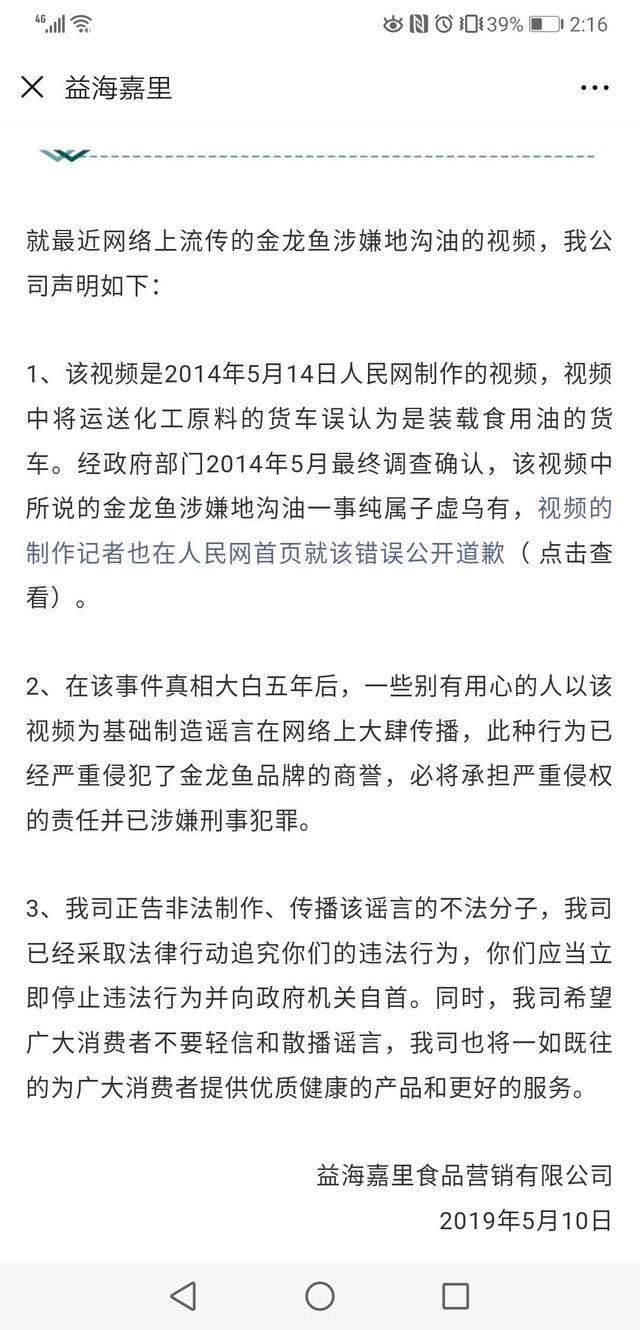 我意识到,这事又闹大了。果不其然,紧接着,就在益海嘉里公司的公众号上看到以下声明。