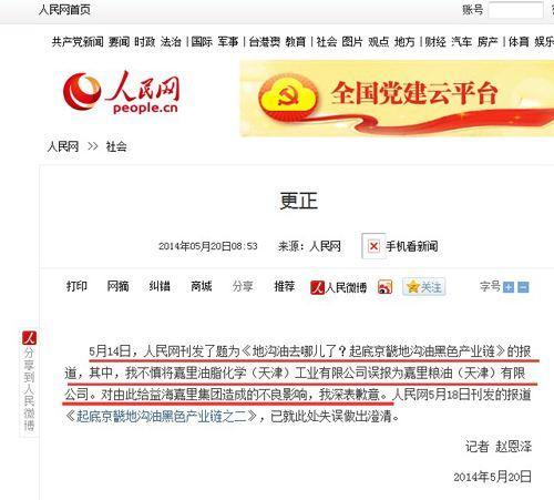 5月20日,人民网在其首页刊登《更正》,采访记者承认此前报道涉及嘉里粮油(天津)的内容有误,并向金龙鱼母公司益海嘉里集团道歉。