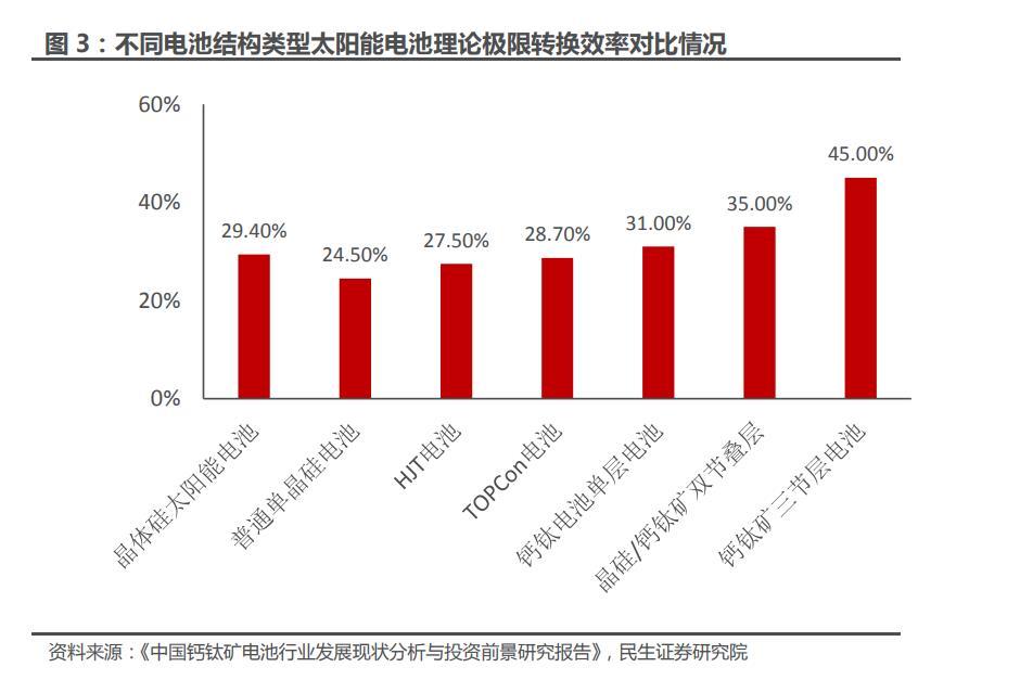民生证券表示,钙钛矿太阳能电池世界最高光电转换效率纪录已达到25.2%。
