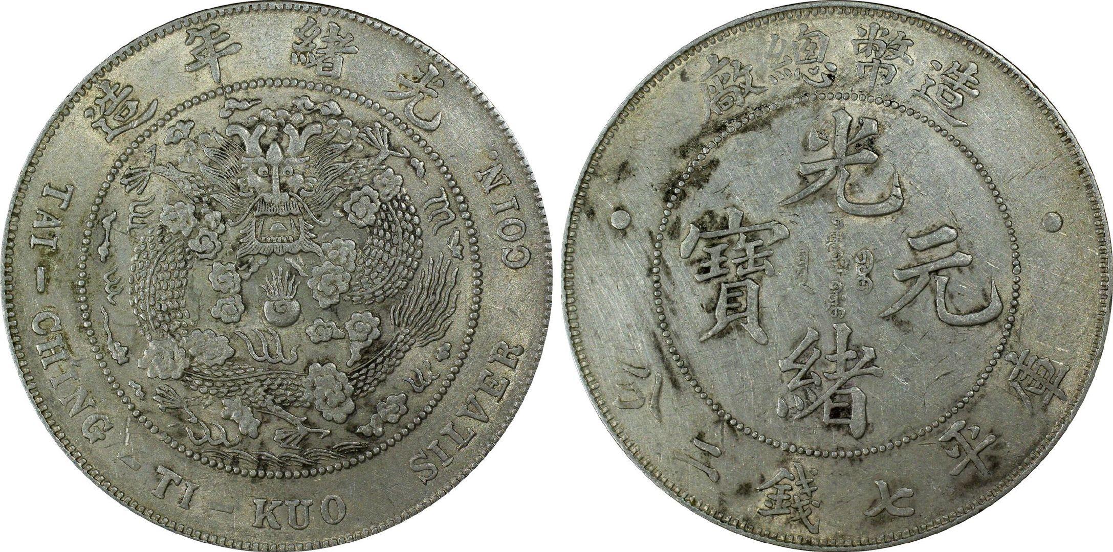清末“庚子”龙洋标注的“库平七钱二分”。至于为何如此标注,是因为一元银币与七钱二分等重。