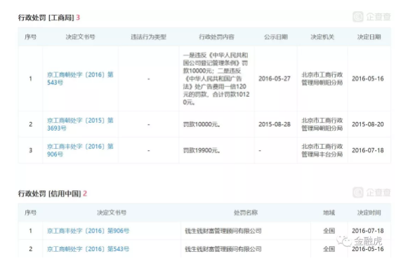 据企查查信息显示,2015年和2016年,钱生钱分别因违反《中华人民共和国公司登记管理条例》和《中华人民共和国广告法》被累计罚款40020元。今年8月,钱生钱还因未按时履行法律义务被北京市顺义区人民法院强制执行。