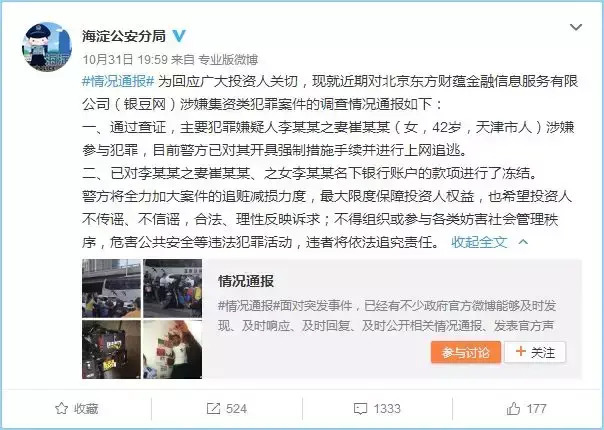 之前,不少居民关注的的“银豆网”目前海淀公安分局也给出了相应的情况进展通报!