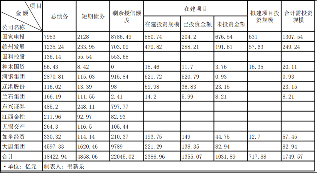 为便于读者更深入地了解这些企业的债务状况和资金需求状况,我们将这些企业的总债务、短期债务、授信余额、在建项目、拟建项目等数据做成了一个表格,让读者能够更直观地了解到这些企业的情况,便于做出决策。这个表格如下: