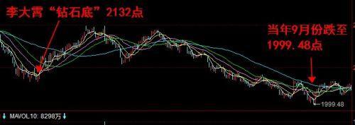 最早是“钻石底”,2012年元月,李大霄称大首次提出大盘2132点就是钻石底,且当年春节前后的大盘上涨是始于2132点“钻石底”的一波牛市起点。随后,上证指数确实逼近2500点、徘徊在2400点左右。当年8月,李大霄大胆预测“钻石底已基本筑牢”,但很快到了9月份末,“打脸”来了,上证指数再一次跌至2000点以下。