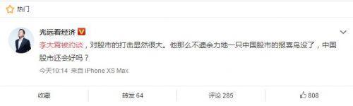 23日上午,著名经济学家马光远也发微博侧面证实了李大霄被约谈一事,他把李大霄称之为A股的报喜鸟,多年来不遗余力地唱多A股,李大霄被约谈,对中国股市打击很大。截止23日收盘,上证指数下跌3.11%收2660.17点。