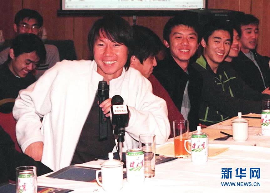 图为2000年11月19日,健力宝足球队七年再回首活动在北京举行,来自辽宁队的李铁(前)在发言。 新华社记者官天一摄