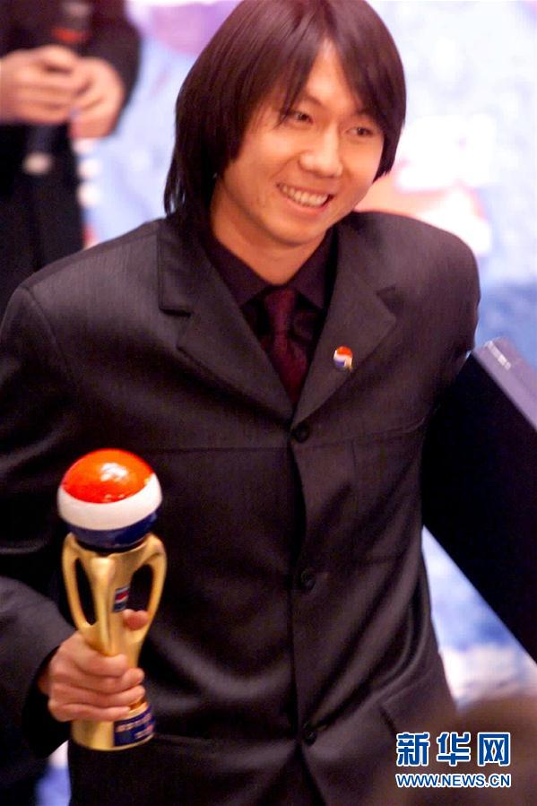 图为2001年12月20日,百事可乐足球联赛2001精英评选颁奖典礼在北京举行,辽宁抚顺队球员李铁被评为联赛足球先生。 新华社记者李岳摄