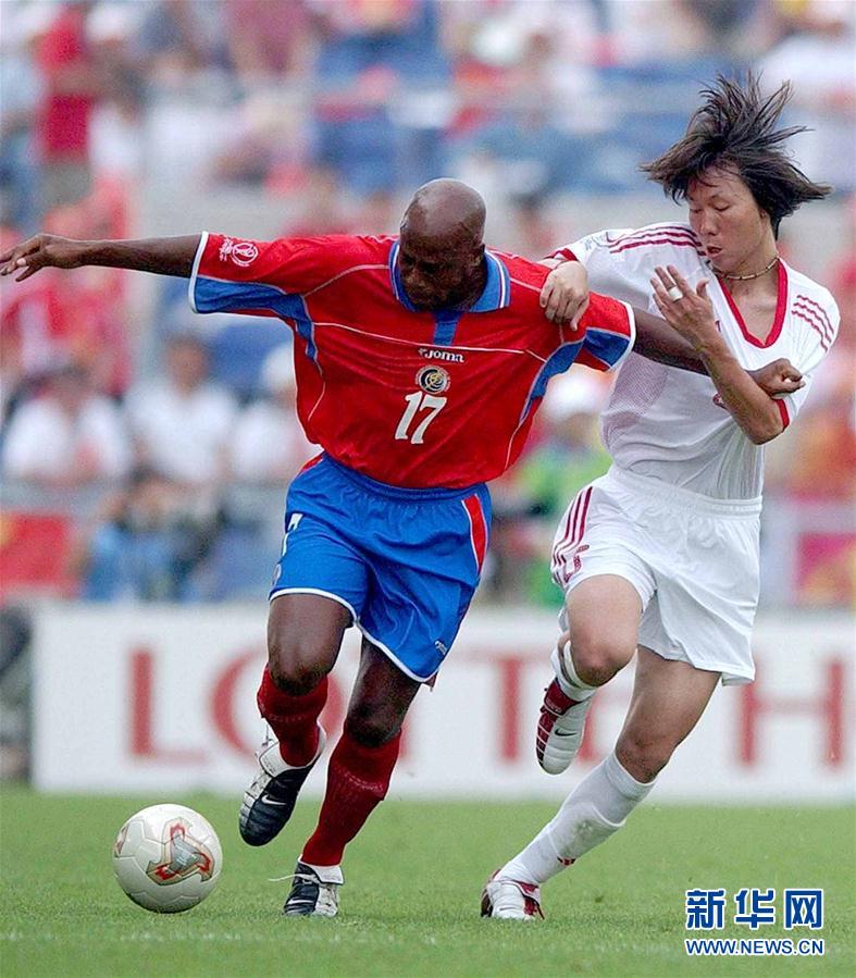 图为2002年6月4日,在韩国光州进行的世界杯C组第二场比赛中,中国队球员李铁(右)和哥斯达黎加队球员梅德福拼抢。中国队首战以0比2负于哥斯达黎加队。 新华社记者戚恒摄