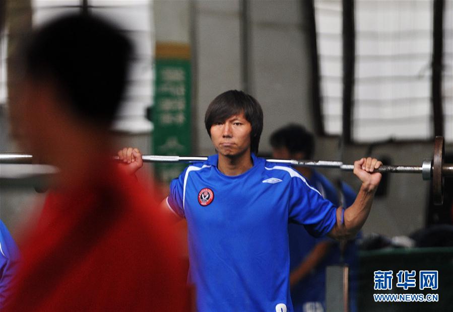 图为2008年6月3日,中超成都谢菲联队球员李铁进行力量训练时,他的身影映在镜子里。 新华社记者邹峥摄