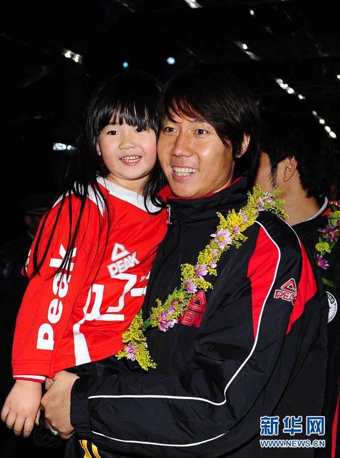 图为2009年10月14日,辽宁宏运队球员李铁与女儿庆祝夺冠并“冲超”成功。当日,在2009赛季中国足球甲级联赛第24轮比赛中,辽宁宏运队主场以5比1战胜南京有有队,提前获得2009赛季中国足球甲级联赛冠军,重返中超联赛。 新华社记者任勇摄
