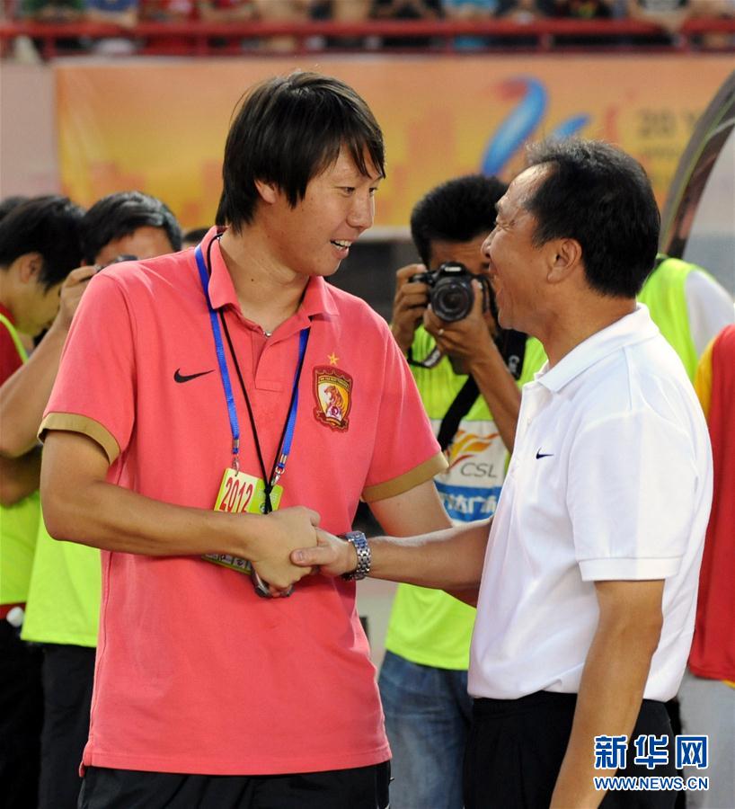 图为2012年7月21日,广州恒大队体能教练李铁(左)与河南建业队新任主帅沈祥福在比赛开始前握手。当日,在2012赛季中超联赛第18轮比赛中,广州恒大队客场挑战河南建业队。 新华社记者李博摄
