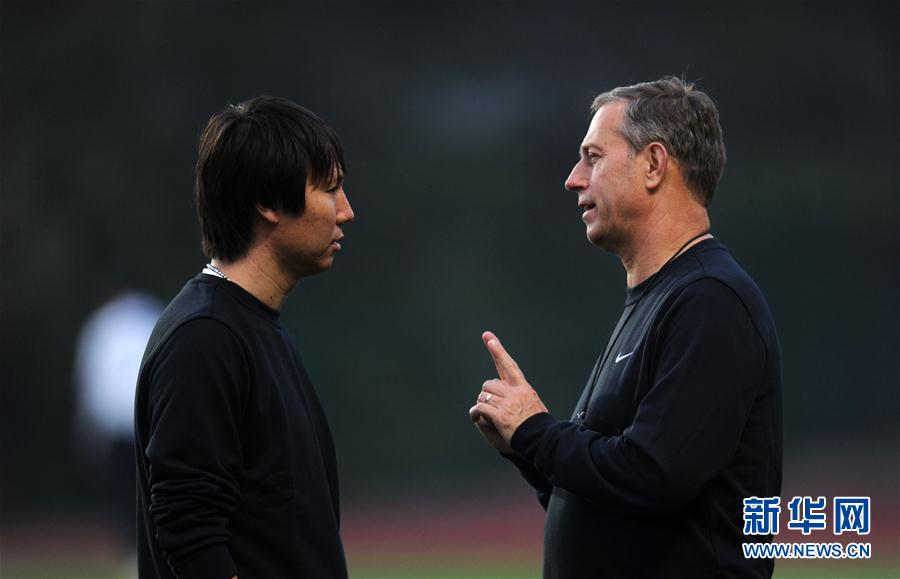 图为2015年3月23日,中国队主教练佩兰(右)和助理教练李铁在训练中交流。当日,中国男子足球队在长沙贺龙体育中心附场进行训练,备战将于3月27日进行的与海地国家队之间的热身赛。 新华社记者李尕摄
