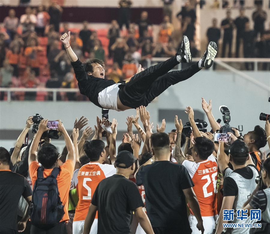 图为2018年10月6日,武汉卓尔队球员赛后将主教练李铁(上)抛起庆祝。当日,在2018赛季中国足协甲级联赛第27轮比赛中,武汉卓尔队主场以2比2战平梅县铁汉生态队,凭借积分优势提前三轮冲超成功。 新华社记者熊琦摄