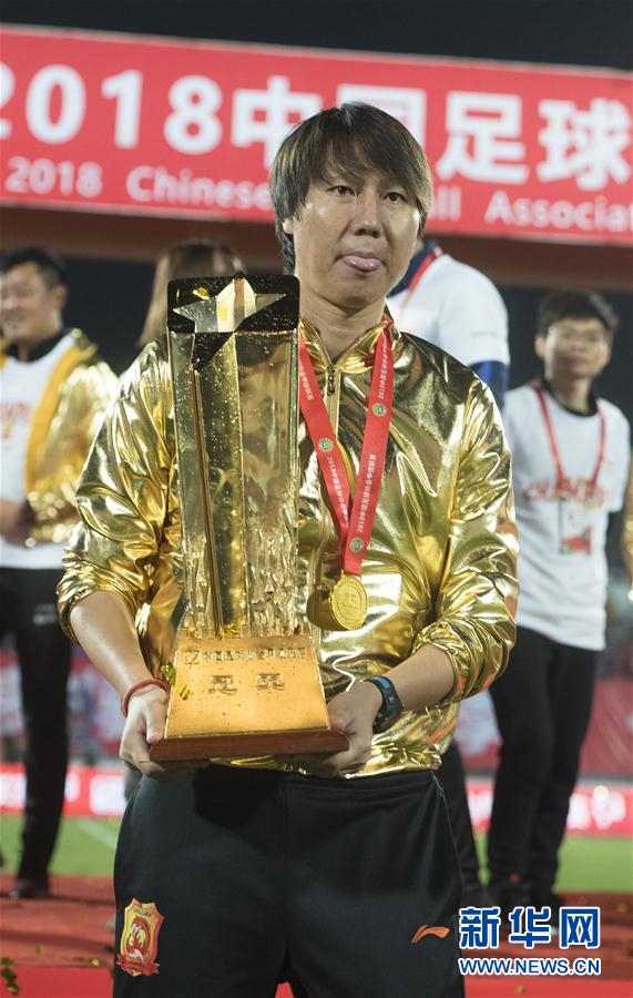 图为2018年10月20日,武汉卓尔队主教练李铁手捧中甲冠军奖杯留影。当日,在2018赛季中甲联赛第28轮比赛中,武汉卓尔队主场以3比1战胜梅州客家队。武汉卓尔队在本赛季已提前三轮夺冠。 新华社记者肖艺九摄