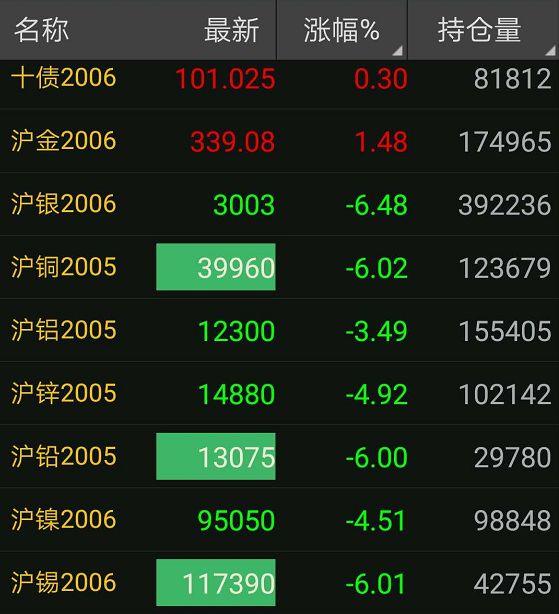 收盘,沪铜、沪锡、沪铅期货主力合约均告跌停;沪锌、沪镍期货主力合约分别跌4.92%、4.51%,沪铝跌3.49%。