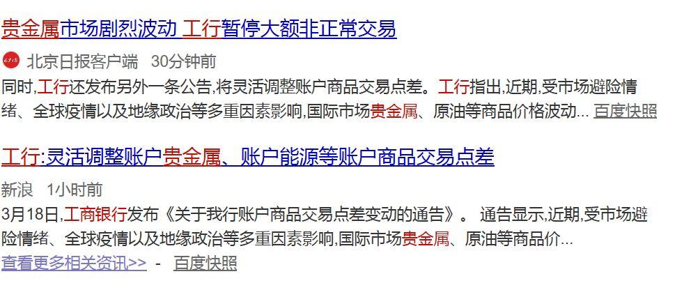 3月18日,工商银行通告称,“近期,国际市场贵金属等大宗商品价格波动剧烈,我行在账户商品业务日常监控中发现个别客户多次进行大额非正常交易,且具有明显的区域性和组织性。对于开展非正常交易的客户,我行将根据与客户签署的协议约定,采取终止账户商品交易服务等相关措施,并保留进一步采取法律措施的权利。”