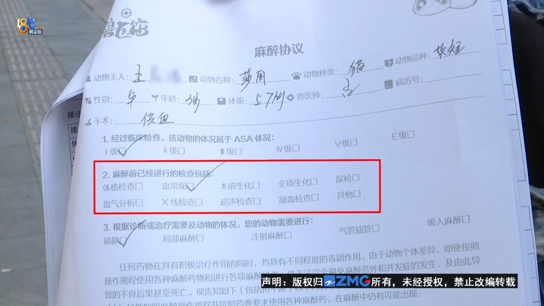 小章说,“莎莉”是她男友的妹妹在养,当时医院出示了试剂图片,表示两只猫血型适配。之后,小章的男友签了供血手术的麻醉协议,显示麻醉前只进行了血常规检查。术后第二天,医院说猫的情况还是不太好,得再次输血,不过,当时“莎莉”已经被送回去了。最终她和男友决定,