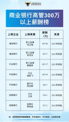 近日,运营商财经网紧追金融业高薪热点,根据上市公司2021年年报披露的信息,推出了“商业银行高管300万以上薪酬榜”,其中,浦发银行职工监事何卫海登上该榜单。