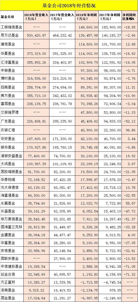 昨晚中国银行(601988)、农业银行(601288)、交通银行(601328)、民生银行(600016)、华泰证券(601688)、西南证券(600369)等上市公司披露年报,旗下基金公司经营情况随之曝光。截至目前,已有34家基金公司2018年合计共赚143.88亿元,比2017年同期的158.54亿元下滑9.23%。
