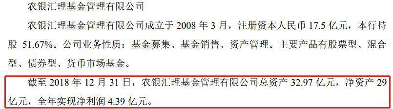 农银汇理基金2018年净利润增长迅猛。农业银行昨晚公布的年报显示,其持股51.67%的农银汇理基金,2018年全年实现净利润4.39亿元,较2017年同期(净利润2.23亿元)大幅增长96.86%。另外,截至2018年底,农银汇理的总资产为32.97亿元,净资产为29亿元。